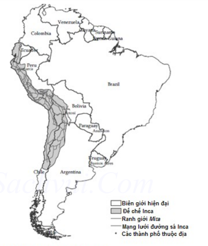 Bản đồ 1: Đế chế Inca, mạng lưới đường sá Inca, và địa bàn hoạt động của hệ thống cai trị mita để khai thác khoáng sản