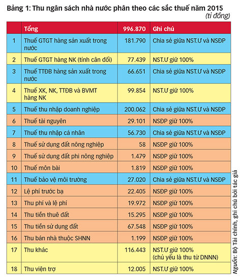 Theo ước tính thu ngân sách nhà nước (NSNN) năm 2015, các khoản thu NST.Ư hưởng 100% có giá trị ước khoảng 305,7 nghìn tỉ đồng, chiếm 30,7% tổng thu NSNN; các khoản thu NSĐP hưởng 100% có giá trị khoảng 158,9 nghìn tỉ đồng, chiếm 15,9% tổng thu NSNN. Phần còn lại trị giá 532,3 nghìn tỉ đồng, chiếm tới 53,4% được chia sẻ giữa NST.Ư và NSĐP (chi tiết xem bảng 1).