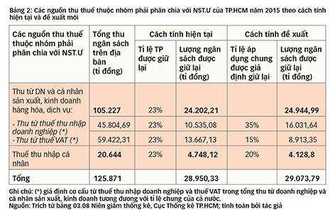 Chẳng hạn, nếu áp dụng tỉ lệ cho phép địa phương giữ lại 35% nguồn thu từ thuế TNDN, 15% thuế VAT và 20% thuế TNCN thì số thu mà TP.HCM giữ lại cũng sẽ gần tương đương mức 23% áp dụng chung hiện nay cho tất cả các sắc thuế.