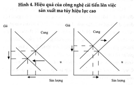 Điều gì đã làm cho hiệu lực của ma túy sau khi bị cấm gia tăng một cách ghê gớm như thế? Những thay đổi công nghệ ngoại sinh và thị hiếu người tiêu dùng thay đổi có thể mang đến cho chúng ta lời giải thích. Ví dụ, trên Hình 4, thị trường ma túy đã được chia thành thị trường ma túy hiệu lực cao và thị trường hiệu lực thấp. Nếu thay đổi công nghệ làm giảm giá thành túy có hiệu lực cao thì đường cung sẽ dịch về bên phải, sự dịch chuyển này làm giá giảm và tăng lượng cầu. Những thay đổi như thế trên thị trường ma túy có hiệu lực cao sẽ dẫn đến giảm cầu về ma túy có hiệu lực thấp. Những sự kiện này có thể giải thích kết quả tương tự mà người ta quan sát được khi áp dụng những biện pháp cấm đoán.