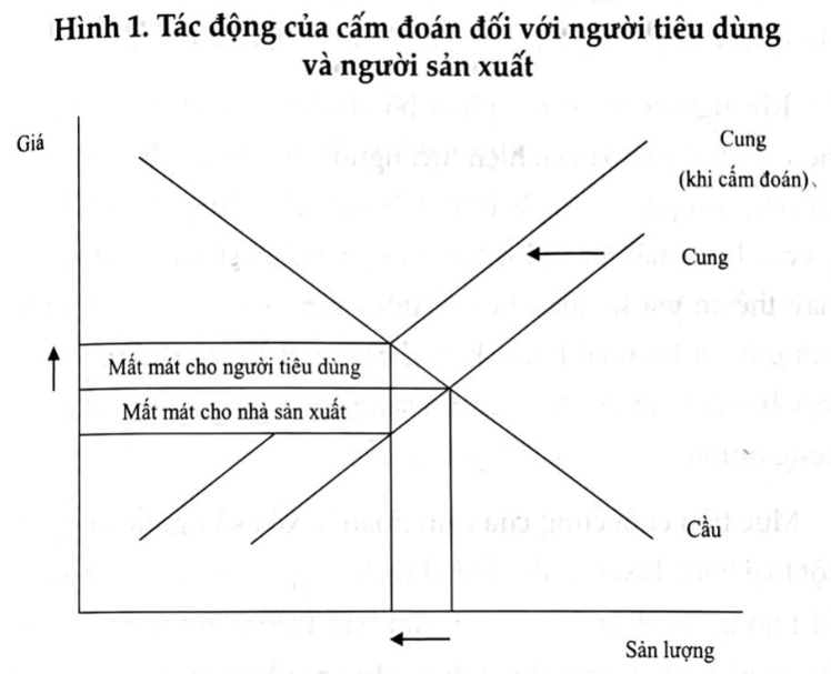 Hậu quả trực tiếp của những biện pháp cấm đoán là tổn thất cho cả người tiêu dùng lẫn người sản xuất sản phẩm đó. Người tiêu dùng mất độ thỏa dụng vì giá cao hơn và phải thay thế bằng những loại hàng hóa có giá trị thấp hơn. Nhà sản xuất mất thu nhập và độ thỏa dụng vì phải chấp nhận làm ngành nghề khác với nghề mà họ có lợi thế so sánh. Kết quả được thể hiện trên Hình 1.