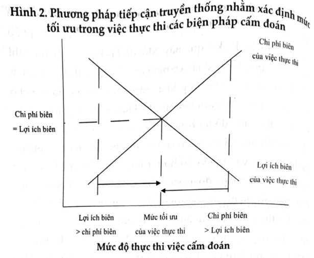 Những người hoạch định chính sách phải tìm được mức tối ưu của việc thực thi bằng cách xác định những lợi ích mà việc thực thi mang lại (trong việc ngăn chặn sản xuất và tiêu thụ sản phẩm bị cấm) và những chi phí cho nỗ lực này (hiện nay chỉ giới hạn ở những chi phí trực tiếp của việc thực thi). Bằng cách sử dụng “biện pháp tiếp cận truyền thống” được mô tả bên trên để thực hiện những quyết định này, họ có thể chỉ ra được mối quan hệ giữa chi phí của việc thực thi pháp luật và giá cả và số lượng của sản phẩm bị cấm. Kết quả đạt được sẽ giải thích vì sao ở các nước dân chủ cấm đoán không bao giờ được thi hành một cách trọn vẹn – chi phí cho việc thực thi một cách trọn vẹn vượt xa lợi ích thu được.