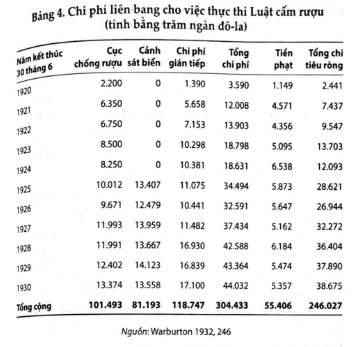Bảng 4 cho ta thông tin liên quan đến những cố gắng nhằm thực thi cấm đoán của liên bang1. Tổng chi tiêu đã tăng từ chưa đến 4 triệu đô-la trong nửa sau năm 1920 lên gần 45 triệu đô- la trong năm 1930. Ngân sách hàng năm của Cục Phòng Chống Rượu đã tăng gấp đôi trong thập kỷ này, tốc độ tăng trưởng nhanh nhất là từ năm 1920 đến năm 1925. Năm 1925, ngân sách của Cảnh sát biển đã được tăng cường nhằm thực thi Luật cấm rượu, với nguồn lực dành cho ngăn chặn và thực thi luật cấm gia tăng gấp đôi. Các chi phí gián tiếp, trong đó có những chi phí như chi phí cho tố tụng hình sự, cũng tăng trong suốt thập kỷ này.