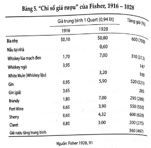 Như đã đề cập ở trên, Irving Fisher là một người ủng hộ mạnh mẽ Luật cấm rượu. Ông đã sử dụng những kết quả quan sát được về tăng giá để tuyên bố rằng Luật Cấm đã làm kiệt quệ nguồn cung rượu. Fisher sử dụng các dữ liệu trong Bảng 5 để củng cố cho luận điểm của mình. Các tính toán trong ngoặc đơn là của tôi. Những tính toán của Fisher bên phải có nguồn gốc không rõ ràng. Trên thực tế, ông đã chỉ ra trong “Chỉ số giá rượu” là giá rượu đã tăng. Ông cũng chỉ ra rằng giá bia nhẹ tăng 700% trong khi rượu whisky nấu bằng lúa mạch đen chỉ tăng 312%, một lần nữa chứng tỏ rằng giá tương đối của rượu mạnh đã giảm.