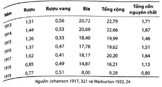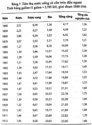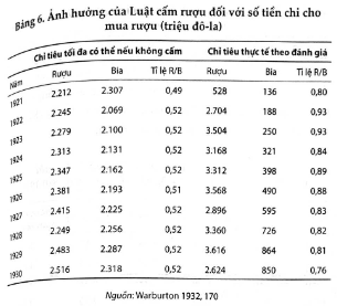 Từ năm 1890 đến năm 1910 chi tiêu cho đồ uống có cồn tính trên thu nhập quốc dân đã giảm 2%, chỉ cho bia nhiều hơn chi cho rượu (tỉ lệ là 55:45), từ năm 1911 đến năm 1916 tỉ lệ này vẫn giữ nguyên (Warburton, 1932, 114-15). Sau khi Luật cấm rượu bị. bãi bỏ, tình hình tiêu thụ rượu trở lại như thời chưa cấm, chi phi cho rượu chỉ chiếm một nửa tất cả chi phí cho các loại nước uống. có cổn. Trong giai đoạn Cấm Rượu (1922-1930) chi phí cho rượu. chiếm từ 70 đến 87% chi phí cho tất cả các loại nước uống có cồn Trong giai đoạn từ 1939 đến 1960 chi phí cho rượu chỉ chiếm từ 42 đến 53% toàn bộ lượng nước uống có cồn.