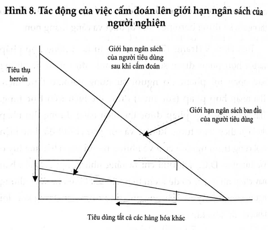 Giới hạn ngân sách ban đầu của người tiêu thụ trong Hình 8 đã được xác định trước bởi sự lựa chọn giữa lao động và nghỉ ngơi. Nhưng sự thỏa hiệp giữa lao động và nghỉ ngơi còn bị ảnh hưởng bởi cấm đoán theo cách phi truyền thống. Giá heroine tăng quá cao trong giai đoạn cấm đoán tạo ra một giới hạn ngân sách mới. Đối với người có nhu cầu heroine không thể co dãn thì cấm đoán cũng chẳng khác gì nạn đói làm tăng giá lương thực lên mấy trăm phần trăm. Giá các sản phẩm bị cấm tăng sẽ hoặc không ảnh hưởng tới mức lương danh nghĩa, do đó mức lương thực tế (sức mua) giảm. Mức lương thực tế giảm thường làm tăng thời gian nghỉ ngơi (chẳng vui vẻ gì đối với người nghiện heroine), nhưng ở đây chúng ta có thể nghĩ rằng thời gian làm việc sẽ nhiều hơn hoặc họ sẽ chuyển sang công việc có mức lương cao hơn vì rủi ro lớn hơn (ví dụ, tội ác). Dù thế nào thì người sử dụng heroine cũng bị thiệt và căng thẳng hơn.