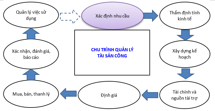 Quản lý và sử dụng tài sản công trong các cơ quan, đơn vị và doanh nghiệp thường là một chu trình quản lý bao gồm các hoạt động sau: i) Xác định nhu cầu tài sản; ii) Thẩm định tính kinh tế; iii) Xây dựng kế hoạch sử dụng tài sản; iv) Xây dựng kế hoạch ngân sách và tài chính; v) Định giá tài sản; vi) Tiến hành mua sắm, thanh lý, thải loại tài sản; vii) Thực hiện chế độ báo cáo, kế toán, thống kê; viii) Quản lý, giám sát quá trình sử dụng tài sản.