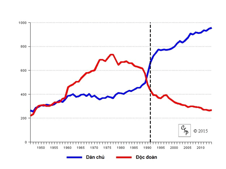 Kể từ sau Thế chiến 2 trở lại đây, các quốc gia, đặc biệt là những quốc gia giành được độc lập, thoát khỏi hệ thống thuộc địa, đã lựa chọn những mô hình chính trị khác nhau để tạo ra một nhà nước đại diện cho quyền lợi của đa số người dân, đảm bảo quyền làm chủ của nhân dân. Như Hình 1.3 chỉ ra, theo phân loại thống kê của Center for Systemic Peace, một tổ chức nghiên cứu độc lập, trong những thập kỷ đầu tiên sau Thế chiến 2, tỷ lệ lựa chọn mô hình độc đoán và mô hình dân chủ là tương đối ngang nhau. Tuy nhiên, mô hình chính trị mang tính dân chủ đa đảng ngày càng được nhiều quốc gia lựa chọn hơn kể từ những năm 1980 trở lại đây.