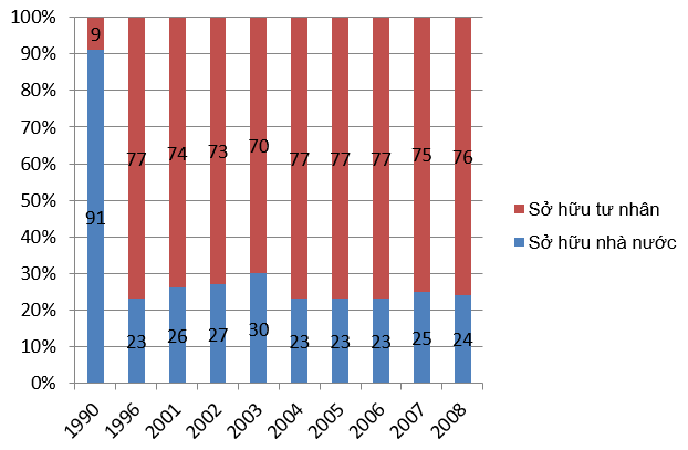 Hình 1.4. Tỷ trọng tài sản cố định của doanh nghiệp nhà nước và doanh nghiệp tư nhân của Liên bang Nga, 1990-2008