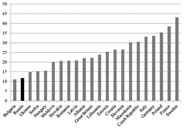 Khi sử dụng các biện pháp đo lường xã hội dân sự thông thường, xã hội dân sự Nga được coi như là yếu nhất so với các xã hội dân sự của các nước khác ở khu vực Tây Âu, và thậm chí còn yếu hơn cả những khu vực thuộc khối xã hội chủ nghĩa trước đây ở châu Âu. Theo báo cáo Life in Transition Survey II, thực hiện bởi Ngân hàng tái thiết và phát triển châu Âu (EBRD) và Ngân hàng Thế giới vào năm 2010 trên khoảng 39 ngàn hộ gia đình trên 34 quốc gia, Nga có mức độ thấp nhất về công dân tham gia vào các tổ chức tình nguyện (active membership), thấp nhất về mức độ tham gia đình công và biểu tình, và thấp nhất về mức độ kiện cáo trong tất cả các nước châu Âu sau khi khối xã hội chủ nghĩa tan rã (EBRD và WB, 2011). Một số nước hậu cộng sản năm 2010 đã đạt tới mức độ phát triển xã hội dân sự bằng với các nước khu vực Tây Âu nếu tính theo cách đo lường này. Tuy nhiên, Nga tiếp tục bị bỏ xa lại phía sau, không chỉ tụt hậu so với các nước Tây Âu mà còn so với các nước châu Âu hậu cộng sản khác. Hơn nữa, theo Hình 1.5, người Nga không có nhiều niềm tin vào các tổ chức dân sự. Chỉ có 12% người Nga tin vào các NGOs, một mức rất thấp so với các nước Tây Âu và châu Âu hậu cộng sản khác.