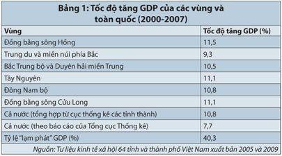 Nghịch lý 1: Tất cả các địa phương đều tăng trưởng cao hơn mức trung bình của cả nước. Vì khuôn khổ bài báo không cho phép liệt kê danh sách tất cả các tỉnh, thành trong toàn quốc nên bảng 1 chỉ tóm tắt tốc độ tăng GDP của các vùng. Theo bảng này, nếu tổng hợp số liệu GDP do cục thống kê của các tỉnh, thành công bố thì tốc độ tăng GDP của Việt Nam trong giai đoạn 2000-2007 là 10,8%, trong khi nếu theo số liệu của Tổng cục Thống kê thì con số này chỉ là 7,7% - một tỷ lệ “lạm phát GDP” lên tới 40,3%.