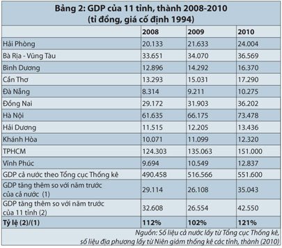 Nghịch lý 2: Đóng góp vào tăng trưởng GDP của 20% số tỉnh lớn hơn của cả nước (bảng 2). Nghịch lý này trên thực tế là hệ quả của Nghịch lý 1, tuy nhiên vẫn được phân tích để cung cấp một cái nhìn rõ ràng hơn về mức độ lạm phát GDP ở cấp độ địa phương. Số liệu của bảng 2 cho thấy chỉ riêng 11 tỉnh đứng đầu về GDP của cả nước trong cả ba năm 2008, 2009, và 2010 cùng nhau “đóng góp”… trên 100% cho tăng trưởng GDP của cả nước. Thậm chí trong năm 2010, tỷ lệ “đóng góp” này còn lên tới 121%.